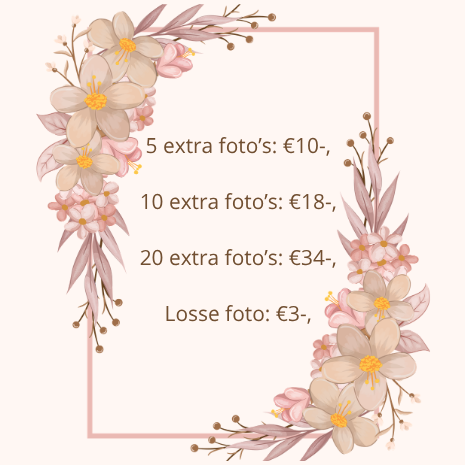 Na de shoot ontvang je een factuur met een afgesproken betaaltermijn. Zodra de betaling is voldaan, lever ik de definitieve foto’s in hoge kwaliteit aan. Je kunt rekenen op een zorgvuldige nabewerking en een snelle, maar realistische levertijd.