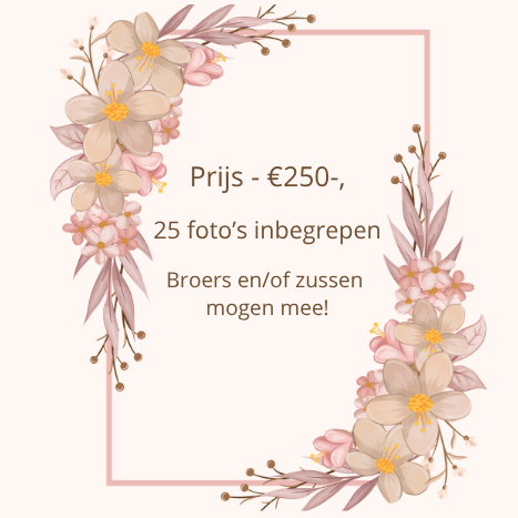 Binnen een week na de shoot ontvang je de bewerkte foto’s digitaal per mail via WeTransfer, in hoge resolutie. Zo kun je snel nagenieten van het resultaat en de bijzondere momenten opnieuw beleven. 💛